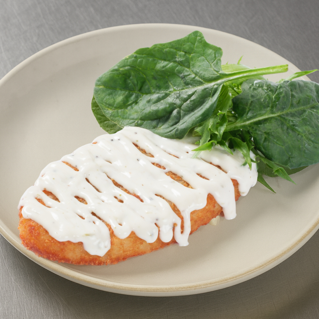 Картофельные драники 2 штуки, жаренный бекон, микс зелени.